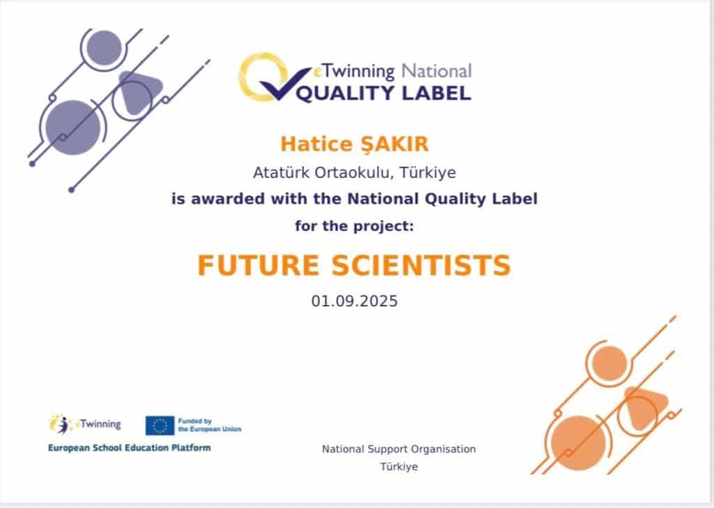 Atatürk Ortaokulu, 2024-2025 Eğitim-Öğretim Yılında İngilizce Öğretmenimiz Sayın Hatice Şakır’ın yürütücülüğünü üstlendiği “Future Scientists” adlı eTwinning projesiyle Ulusal Kalite Etiketi almaya hak kazanmıştır.